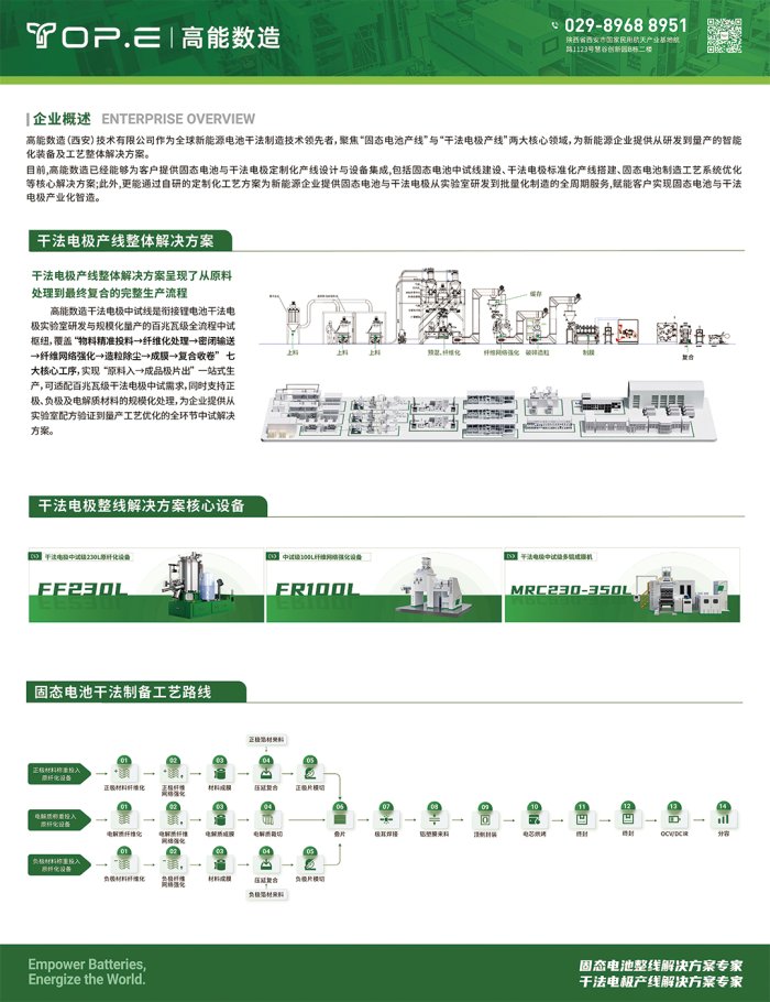 高能數造(西安)技術有限公司是全固態電池智造技術引領者,聚焦"固態電池產線"與"干法電極產線"兩大核心領域,為新能源企業提供從研發到量產的智能化裝備及工藝整體解決方案。