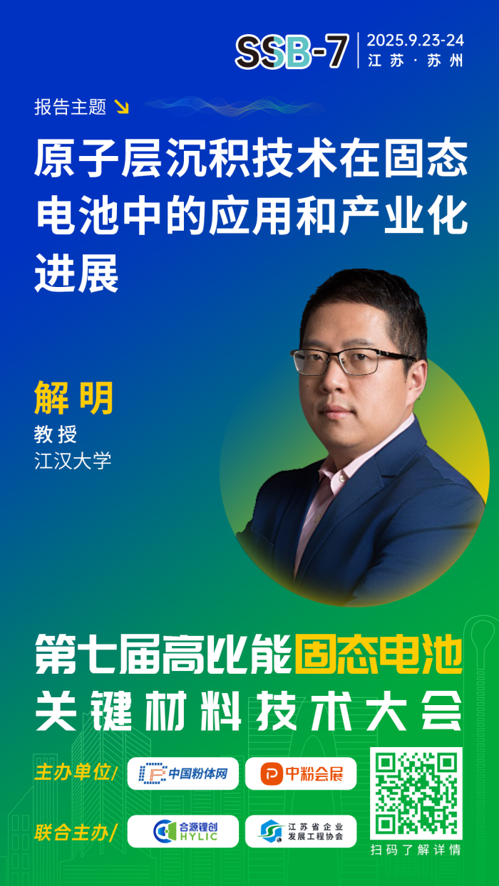 針對(duì)固態(tài)電池產(chǎn)業(yè)化發(fā)展現(xiàn)狀,中國(guó)粉體網(wǎng)聯(lián)合合源鋰創(chuàng)、江蘇省企業(yè)發(fā)展工程協(xié)會(huì)將于2025年9月23-24日在江蘇· 蘇州舉辦第七屆高比能固態(tài)電池關(guān)鍵材料技術(shù)大會(huì)。為致力于固態(tài)電池技術(shù)開(kāi)發(fā)的企業(yè),科研院校,以及新能源汽車、儲(chǔ)能、消費(fèi)電子等終端企業(yè)提供信息交流的平臺(tái),開(kāi)展產(chǎn)、學(xué)、研合作。屆時(shí),來(lái)自江漢大學(xué)的解明教授將作題為《原子層沉積技術(shù)在固態(tài)電池中的應(yīng)用和產(chǎn)業(yè)化進(jìn)展》的報(bào)告。