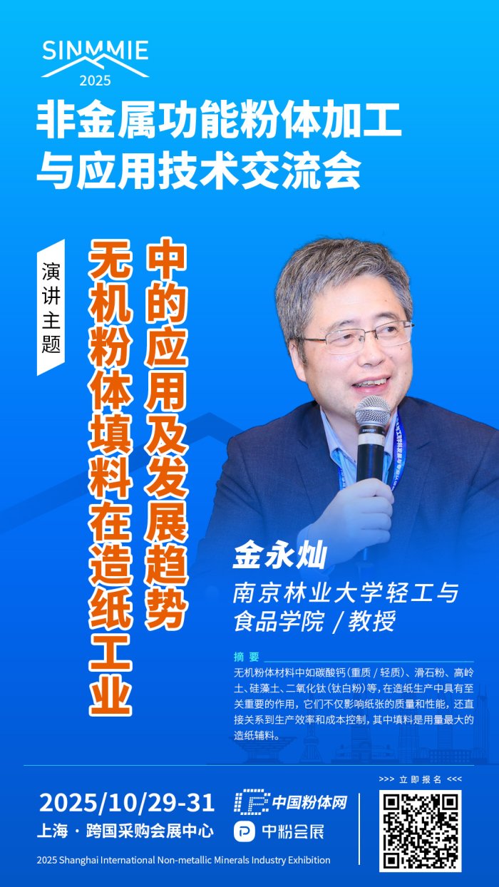 10月29-31日,北京粉體技術(shù)協(xié)會、柏德英思展覽(上海)有限公司、山東中粉會展服務(wù)有限公司將在上海跨國采購會展中心聯(lián)合主辦“上海國際非金屬礦工業(yè)展覽會(SINMMIE2025)”,展會現(xiàn)場將同期舉辦“非金屬功能粉體加工與應(yīng)用技術(shù)交流會”,屆時將邀請南京林業(yè)大學金永燦教授作《無機粉體填料在造紙工業(yè)中的應(yīng)用及發(fā)展趨勢》主題報告,分享碳酸鈣、高嶺土、滑石粉、硅灰石、鈦白粉等粉體材料在造紙行業(yè)中的應(yīng)用技術(shù)和研究成果。