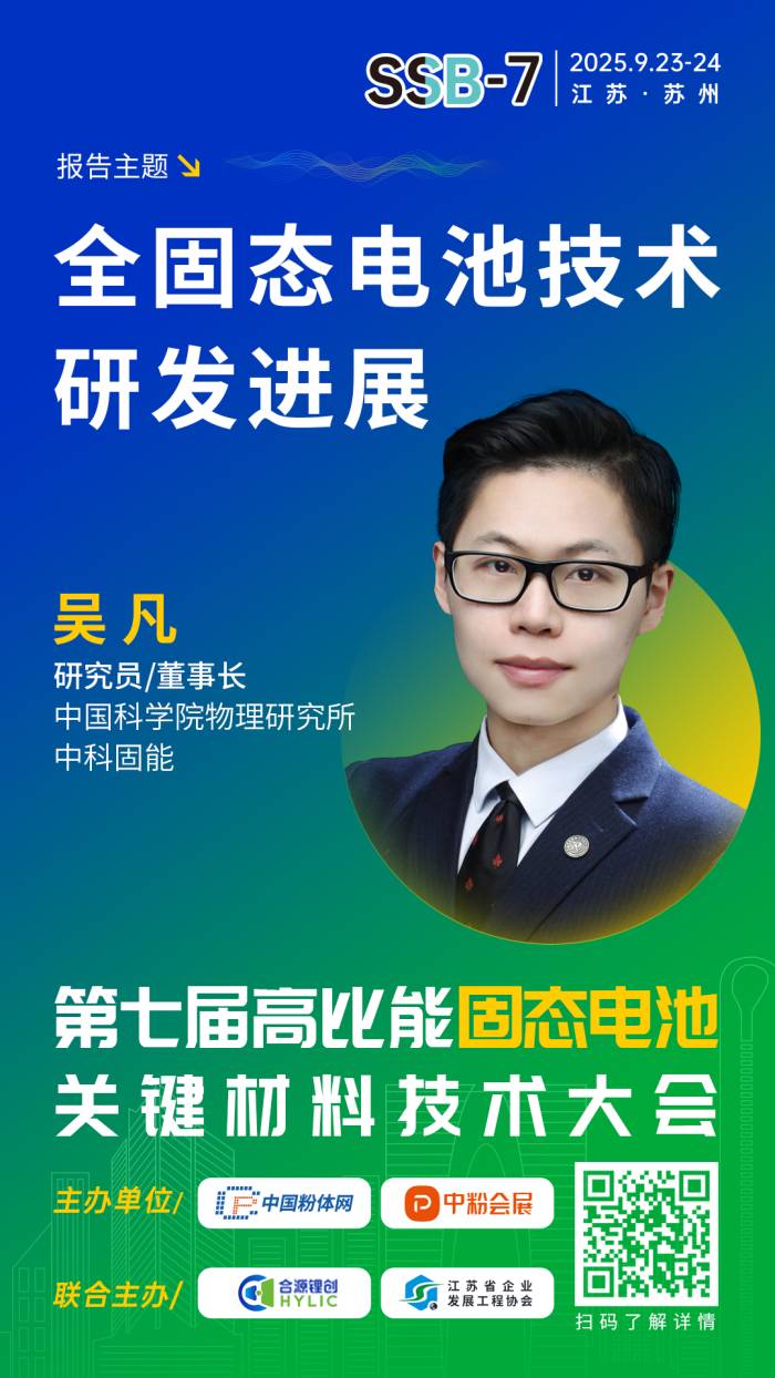 針對固態(tài)電池產(chǎn)業(yè)化發(fā)展現(xiàn)狀,中國粉體網(wǎng)聯(lián)合合源鋰創(chuàng)、江蘇省企業(yè)發(fā)展工程協(xié)會將于2025年9月23-24日在江蘇· 蘇州舉辦第七屆高比能固態(tài)電池關(guān)鍵材料技術(shù)大會。為致力于固態(tài)電池技術(shù)開發(fā)的企業(yè),科研院校,以及新能源汽車、儲能、消費(fèi)電子等終端企業(yè)提供信息交流的平臺,開展產(chǎn)、學(xué)、研合作。屆時,中國科學(xué)院物理研究所研究員、中科固能董事長吳凡將作題為《全固態(tài)電池技術(shù)研發(fā)進(jìn)展》的報(bào)告。