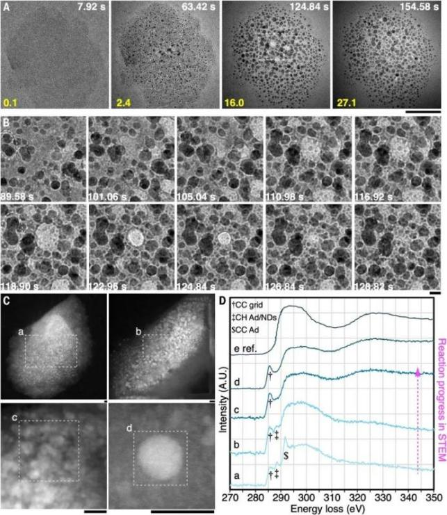 顯微鏡下氫氣泡爆裂及能譜追蹤C-H斷裂和金剛石晶格生成過程