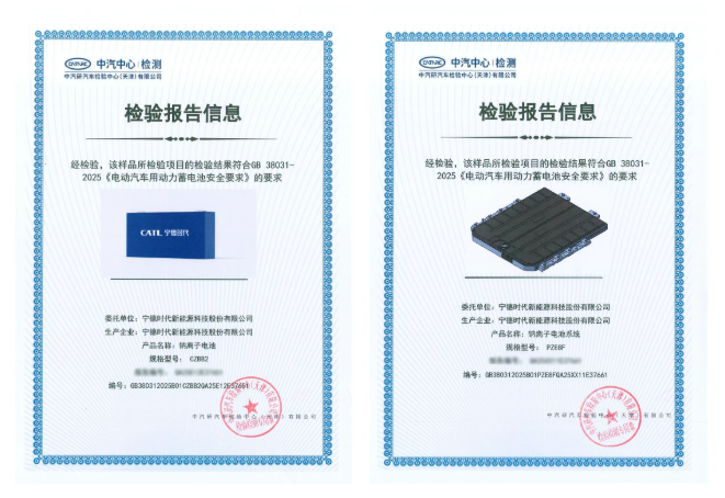 新國標將于2026年7月1日正式實施,旨在從源頭杜絕電動汽車自燃風險,在熱擴散、底部撞擊、快充循環等多個維度,對電池的安全性提出了嚴格要求。在由中汽中心新能源檢測中心執行的第三方權威測試中,寧德時代鈉新電池在電芯與電池包層級均表現出優異的安全性能,順利通過各項試驗。