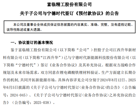 中國粉體網(wǎng)訊 9月18日,富臨精工股份有限公司(以下簡稱“富臨精工”)發(fā)布公告稱,公司控股子公司江西升華新材料有限公司(以下簡稱“江西升華”)于近日與寧德時代新能源科技股份有限公司(以下簡稱“寧德時代”)簽訂《預(yù)付款協(xié)議》,約定寧德時代向江西升華支付共計15億元的預(yù)付款,用于鎖定江西升華向?qū)幍聲r代承諾磷酸鐵鋰供應(yīng)量,并支持江西升華布局更有競爭力的原材料建設(shè)。