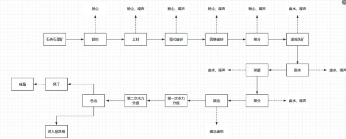 普通石英砂生產工藝主要為:原料裝卸、破碎、篩分、滾筒洗砂、脫水、過濾、球磨、篩分、磁選、水力分級、脫水過濾、色選等。