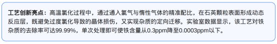 針對石英砂中最難去除的鐵、鋁、鈣等金屬雜質(zhì),研發(fā)團(tuán)隊(duì)創(chuàng)新融合“物理分選+化學(xué)攻擊”工藝鏈:先通過磁選、浮選脫除80%的機(jī)械雜質(zhì),再采用高溫氯化(800-1000℃) 使金屬氧化物轉(zhuǎn)化為易揮發(fā)氯化物,配合氫氟酸-硝酸混合酸浸深度清洗,將雜質(zhì)總量控制在0.08ppm。相較于傳統(tǒng)酸浸工藝,該組合工藝使金屬雜質(zhì)去除率提升40%,尤其對稀土元素的脫除效果顯著優(yōu)于行業(yè)平均水平。