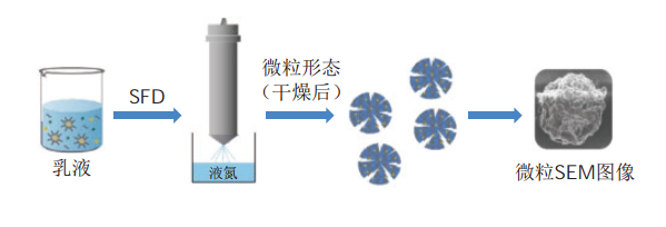 噴霧冷凍干燥過程包括霧化、冷凍和干燥三部分。霧化是指將液體通過噴嘴分解為細小液滴,直接影響最終的顆粒尺寸分布;冷凍是指讓霧化的液滴接觸低溫冷凍液(液氮等)以獲得具有均勻冰結晶的冷凍液滴;干燥是將冷凍液滴中的冰晶直接升華形成干燥顆粒的過程。
