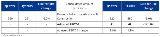 2025年上半年,耐火材料、磨料和建筑解決方案的收入達到5.8億歐元,與去年同期相比(按固定范圍和匯率計算)下降了5%。耐火材料市場的銷售受到歐洲工業活動低迷、中國競爭加劇以及美國工業活動較低(影響較小)的影響。建筑終端市場表現穩健,但也受到受到美國關稅政策的影響,不過總體價格保持穩定,調整后的息稅折舊攤銷前利潤(EBITDA)在絕對值和銷售占比上均有所下降(主要受銷售量下降的影響,而價格/成本平衡的改善和成本節約措施幫助緩解了這一影響)。
