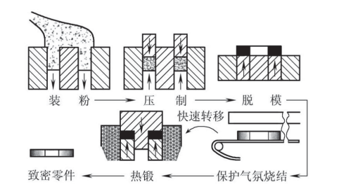 與傳統(tǒng)鍛造工藝不同的是,粉末鍛造先利用粉末冶金方法制備具有一定形狀的預(yù)成形坯,再將預(yù)成形坯置于保護(hù)氣氛或真空環(huán)境下加熱至一定溫度,然后快速轉(zhuǎn)移至經(jīng)過預(yù)熱的閉式鍛模中進(jìn)行鍛造。