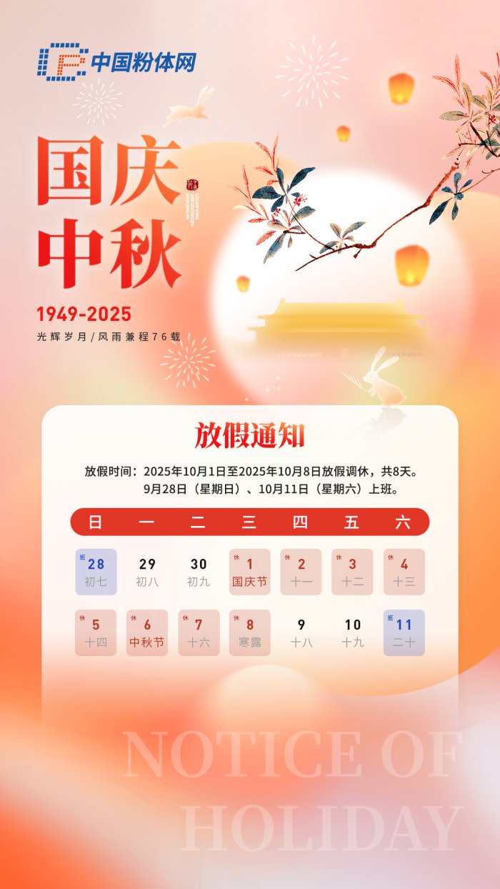 2025年10月1日至10月8日,中國粉體網(wǎng)全體員工放假,網(wǎng)站在此期間將暫停信息更新和相關(guān)服務(wù)。10月9日開始正常上班,各項服務(wù)恢復(fù)正常。