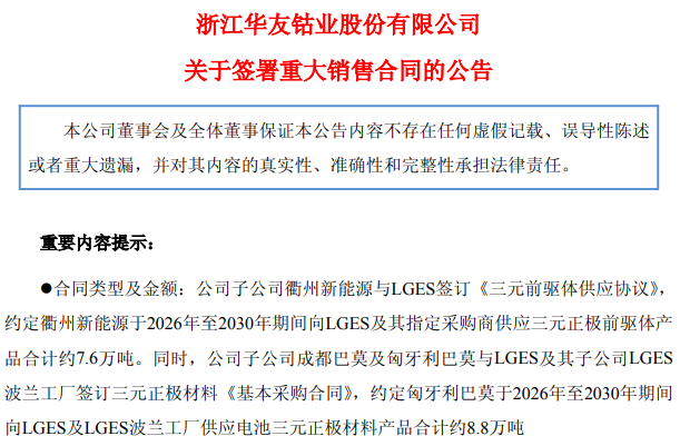 華友鈷業表示,鋰電新能源材料產業是公司重點發展的核心業務,也是公司產業一體化的龍頭。本次與LGES及其子公司簽訂長期供貨合同,有利于進一步深化雙方戰略合作關系,在提升公司鋰電新能源材料市場占有率的同時,持續深化“上控資源、下拓市場、中提能力”的一體化發展優勢,進一步增強公司在鋰電新能源產業鏈中的核心競爭力。合同/協議對當期不產生重大影響,待正式供貨后,預計將對公司2026年至2030年的經營業績產生積極影響。