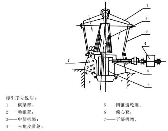 有普通型和液壓型兩種型式。普通型的動錐主軸鉸鏈懸掛在橫梁上;液壓型是利用液壓裝置實現自動調整排礦口和過鐵保護,其動錐主軸用機體下端的液壓缸支承。