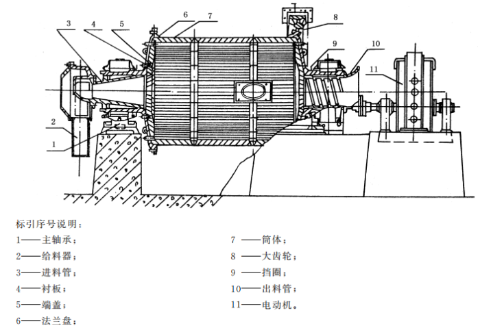 在裝有磨礦介質(鋼球或鋼棒、礫石等)和物料的旋轉筒體內,借助于磨礦介質落下時的沖擊力和運動時的磨削作用而使物料磨碎,由筒型回轉體(簡稱筒體)和兩個主軸承等所組成的機械。