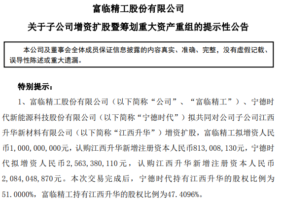 中國粉體網(wǎng)訊 9月29日,富臨精工公告,公司與寧德時代擬共同對江西升華增資擴(kuò)股,公司擬增資10億元,認(rèn)購江西升華新增注冊資本8.13億元,寧德時代擬增資25.63億元,認(rèn)購江西升華新增注冊資本20.84億元。本次交易完成后,寧德時代持有江西升華的股權(quán)比例為51%,公司持有江西升華的股權(quán)比例為47.4096%,江西升華將成為寧德時代的控股子公司。