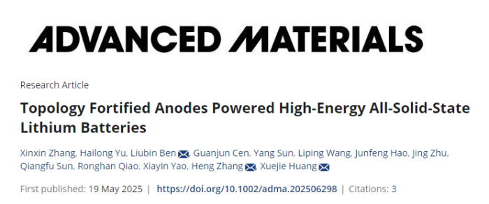 相關(guān)成果以“Topology Fortified Anodes Powered High-Energy All-Solid-State Lithium Batteries”為題發(fā)表于Advanced Materials。物理所博士生張新新和副主任工程師俞海龍共同第一作者,黃學杰研究員為通訊作者,華中科技大學張恒教授為共同通訊作者。