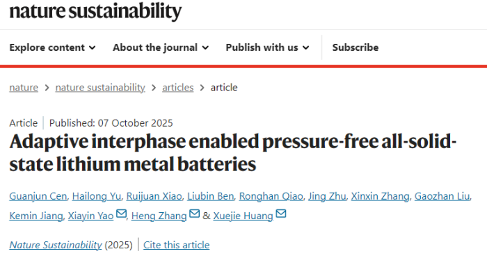 相關(guān)成果以“Adaptive interphase enabled pressure-free all-solid-state lithium metal batteries”為題發(fā)表于Nature Sustainability,并被選為Editor’s Suggestion(編輯推薦),物理所博士后岑官駿和副主任工程師俞海龍共同第一作者,肖睿娟研究員完成計算工作,黃學杰研究員為通訊作者。美國馬里蘭大學王春生教授對研究工作給予高度評價,指出“DAI是解決固-固界面接觸難題的實用化方案”。該工作是全固態(tài)金屬鋰電池邁向?qū)嵱没年P(guān)鍵一步,也為設(shè)計下一代鈉、鉀等固態(tài)電池提供了變革性思路。