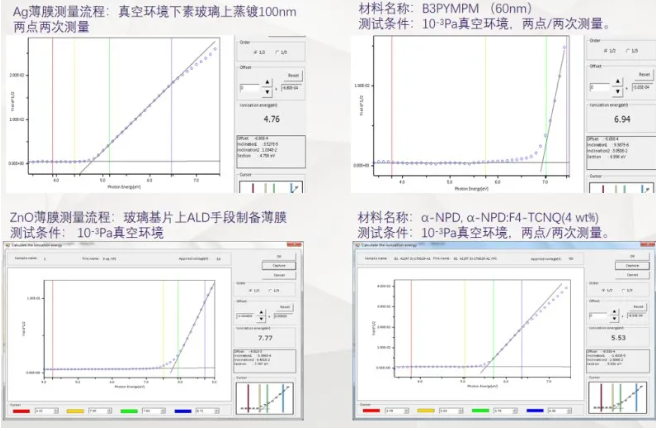 粉末、薄膜、金屬材料、半導體材料、ITO、FTO、OLED有機光電材料、有機太陽能材料、鈣鈦礦材料、富勒烯/石墨烯衍生物、碳納米材料、鋰電池材料等。除IPS-3可測樣品范圍外,還包括:TCNQ衍生物材料、QD光電材料、無機太陽電池材料、金屬氧化物/硫化物材料、水氧敏感型材料等。