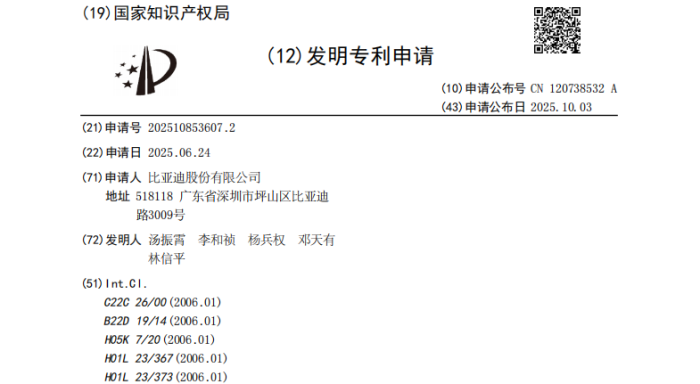 中國粉體網訊 近日,國家知識產權局信息顯示,比亞迪股份有限公司申請一項名為“金剛石-金屬復合材料及其制備方法、散熱基板、功率模塊、車輛”的專利,公開號CN120738532A。這項專利預示著比亞迪在電動汽車核心部件散熱技術上的潛在突破,有望進一步提升電動汽車的性能表現。