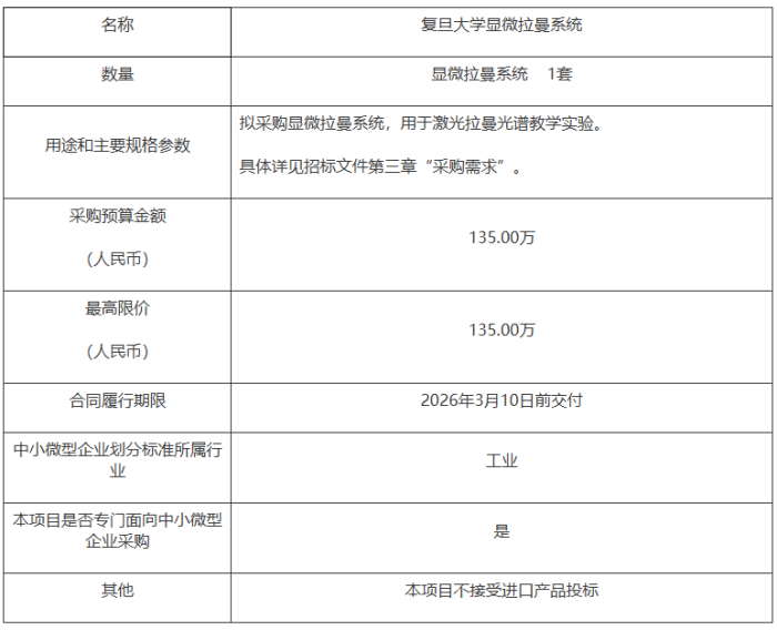 復(fù)旦大學顯微拉曼系統(tǒng) 招標項目的潛在投標人應(yīng)在復(fù)旦大學采購與招標管理系統(tǒng)(網(wǎng)址:https://cz.fudan.edu.cn)獲取招標文件,并于2025年11月05日 09點30分(北京時間)前遞交投標文件。