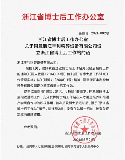 日前,浙江省博士后工作辦公室正式發函,同意批準浙江豐利粉碎設備有限公司設立浙江省博士后工作站,開展博士后培養工作。據悉,這是浙江省首個以“粉碎設備”為研究方向的省博士后工作站。