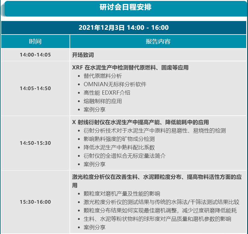 為了解答這些水泥企業關心的問題,馬爾文帕納科將于12月3日(周五)舉辦《先進分析技術助力水泥企業低碳生產》為主題的網絡研討會,屆時將由資深應用工程師介紹最新的XRF、XRD技術在應對水泥行業低碳生產清潔原燃材料所需的分析解決方案,以及馬爾文帕納科激光粒度分析技術如何確保水泥的質量和強度,相比傳統的干篩/水篩法又有何優勢呢?一堂生動的講座從分析技術角度幫您解決問題,精彩內容不容錯過,期待您的關注和參與!