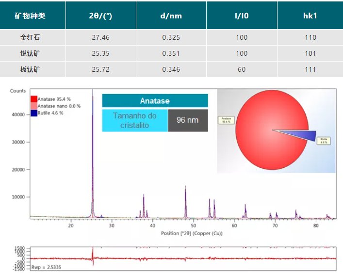 下表為金紅石、銳鈦礦和板鈦礦的XRD主衍射峰數據,可以看到雖然金紅石和銳鈦礦在結構上有共同相似的特點,但由于金紅石與銳鈦礦的最強衍射峰一個在27.46°(/2?)左右,一個在25.35°(/2?)左右,因此將兩者可較輕易區分開來。部分板鈦礦的最強峰與銳鈦礦的最強峰接近,但根據傳統的三強法仍能將兩者區分開來[3]。