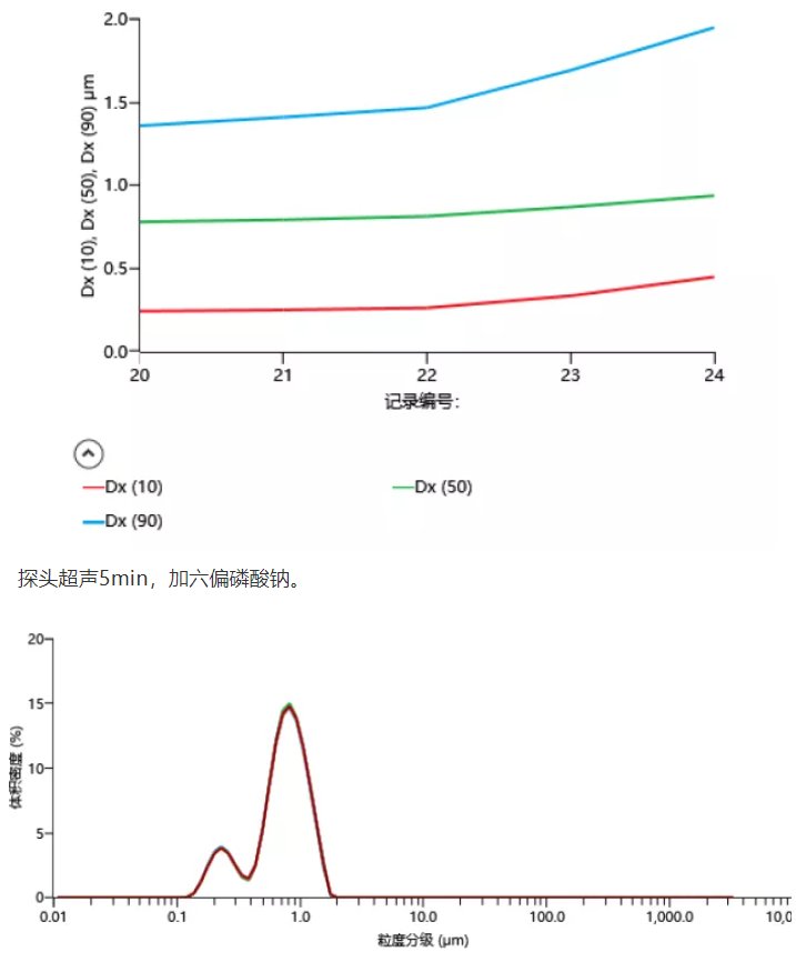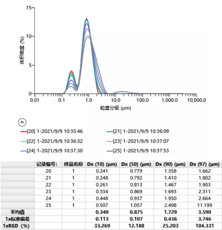 馬爾文帕納科Mastersizer 3000激光粒度儀,探頭超聲5min,連續測試樣品粒徑逐漸增加,粒度分布圖如下。