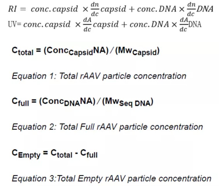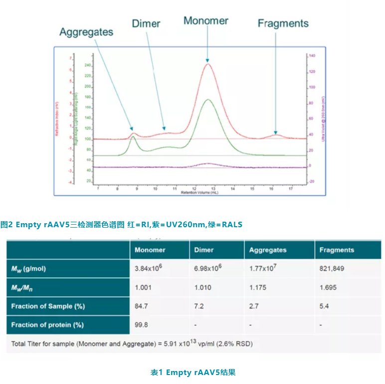對(duì)于主體的單體峰,計(jì)算出其混合物分子量為4.49×106g/mol,其中86%為衣殼。rAAV5的蛋白質(zhì)組分的分子量為3.89×106g/mol,這與表1中Empty rAAV5 的數(shù)據(jù)一致。單體是總體的93.2%,樣本的總滴度為7.48x1013VP/ml。其中單體包含78% Full rAAV5,22% Empty rAAV5。需要注意的是,這種分析方法假設(shè)樣品要么是Full ,要么是Empty ,忽略部分裝載或過度裝載情況。