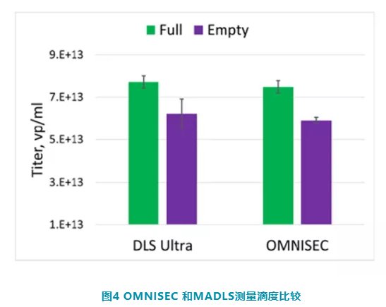 Zetasizer Ultra納米粒度及電位儀可以使用MADLS方式快速確定病毒滴度。從OMNISEC獲得的數(shù)據(jù)與Zetasizer Ultra的粒子滴度進(jìn)行了比較,兩種技術(shù)之間有很好的相關(guān)性,見圖4。
