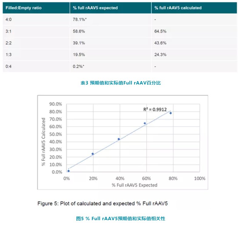 另外,本文將Full rAAV5和Empty rAAV5以確定比例混合,來對(duì)Full rAAV5樣品進(jìn)行分析。表3顯示了每個(gè)樣品的預(yù)期值和實(shí)際值Full rAAV百分比。圖5顯示了期望值和實(shí)際值之間有很強(qiáng)的相關(guān)性,證實(shí)了OMNISEC確定樣品實(shí)心率結(jié)果的可靠性。