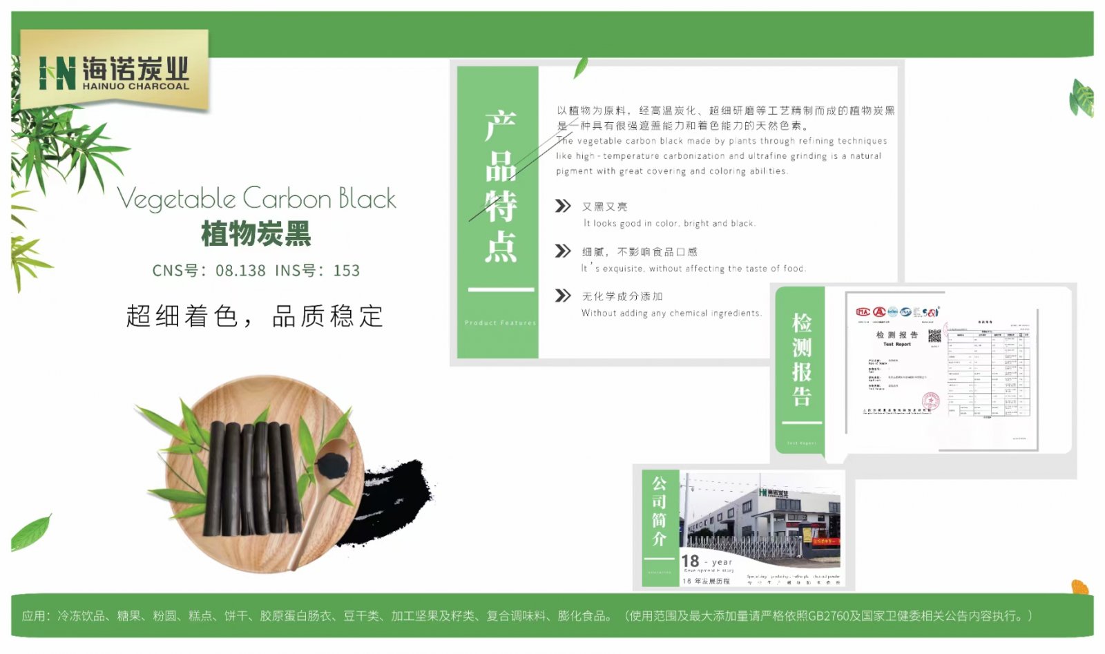 海諾食品添加劑--植物炭黑,是以大別山青竹為原料,經高溫炭化,納米級超細研磨精制而成。產品經國家產品質量監督檢驗院檢測,10項理化指標全部優于國標GB28308,已批量出口歐盟。產品色澤好,又黑又亮;細膩,不影響食品口感;無任何化學成份添加。廣泛應用于冷凍飲品(食用冰除外)、糖果、粉圓、糕點、餅干、膠原蛋白腸衣等。