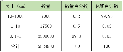 粒度測量的基準指所用的測試方法直接測量的量值,包括個數、長度、面積、體積和重量等。不同的基準所得到的粒度分布數值差別很大。1991 年 10 月 13 日發表在《新科學家》雜志上一篇文章稱,在太空中有大量人造物體圍著地球轉動,科學家們在定期追蹤它們的時候,把它們按大小分成幾組(見上表)。第三列是以數量為基準計算的百分數,這種統計方法中很小的顆粒含量卻最多,0.1-1cm 的顆粒占99.3%;第四列是以體積為基準計算的百分數,這種統計方法中很大的顆粒含量卻最多,就會得出另一個結論是幾乎所有的物體(99.96%)都介于 10cm~1000cm 之間,可見相同樣品的數量分布與體積分布差別很大。如果計算平均值,我們會發現數量平均直徑約為 1.6cm,而體積平均直徑約為 50cm,可見不同基準的平均徑差別也很大。它們是從不同角度來表征樣品特征的,從那個角度講都是正確的。