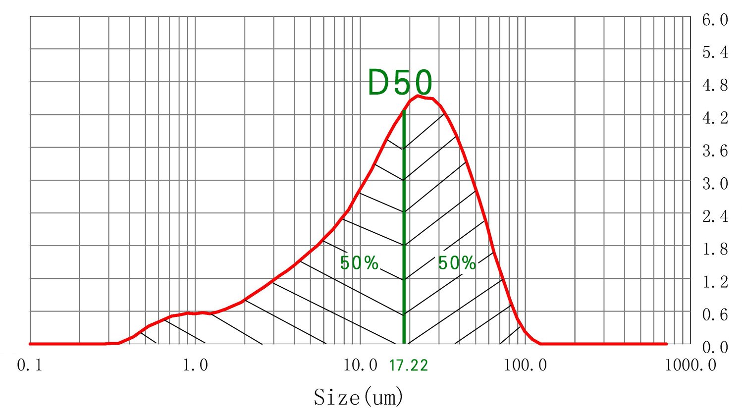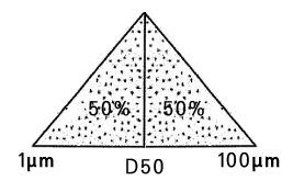 累積分布百分?jǐn)?shù)達(dá)到 50%時(shí)所對(duì)應(yīng)的 粒 徑 值。 D50 又稱(chēng)中位徑或中值粒徑。假設(shè)一個(gè)樣品的 D50=5μm, 說(shuō)明在組成這個(gè)樣品的顆粒中,粒徑大于5μm 的占 50%,小于 5μm 的 顆粒也占 50%。D50 是粉體生產(chǎn)和應(yīng)用中評(píng)價(jià)粉體粒度的一個(gè)典型指標(biāo),通常也用它來(lái)代表粉體的平均粒徑。