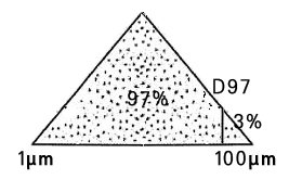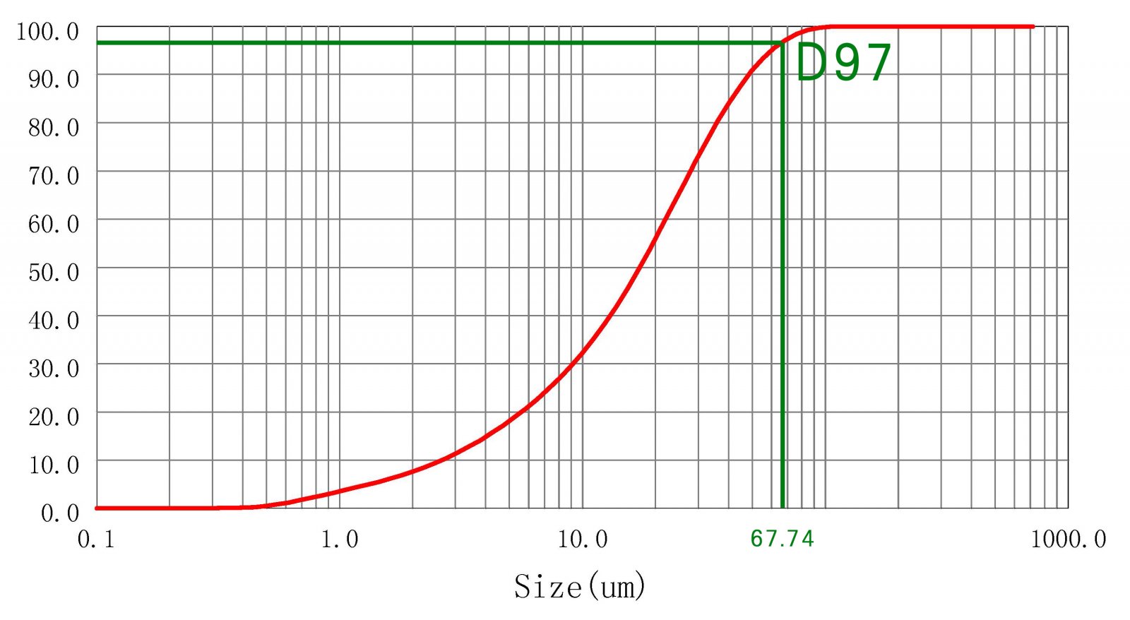 D97是指累積分布百分數達到97%時所對應的粒徑值。 就是說粒徑小于 D97 的顆粒占總量的97%,大于D97的占 3%。D97通常被用來表示粉體粗端粒度指標,是粉體生產和應用中評價粗端的典型指標。有的行業采用D95、D98來表示粉體粗端粒度指標。