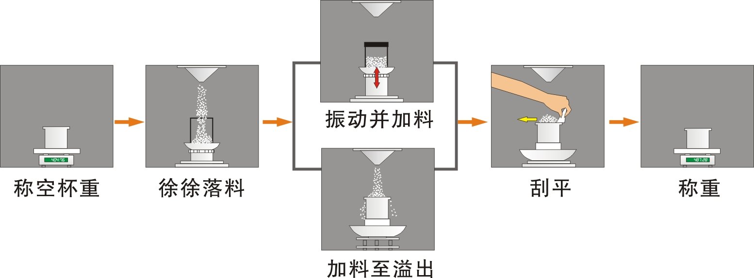 松裝密度:在標(biāo)準(zhǔn)規(guī)定的下落距離或狀態(tài)下,粉體填滿標(biāo)準(zhǔn)容器并刮平后質(zhì)量與容積之比叫松裝密度。它反映常規(guī)形態(tài)下單位體積的容器所盛裝粉體的重量。振實(shí)密度:以標(biāo)準(zhǔn)方法將顆粒填充到容器中,讓容器按一定的振幅和頻率上下振動(dòng),排除粉體中的空氣,直到達(dá)到標(biāo)準(zhǔn)規(guī)定的時(shí)間或振動(dòng)次數(shù)后刮平,這時(shí)的粉體質(zhì)量與容積之比叫振實(shí)密度。振實(shí)密度反映粉體在排除空氣后單位體積的容積所盛粉體的重量。松裝密度和振實(shí)密度參數(shù)常常用于存儲(chǔ)粉體的容器、袋及料倉的設(shè)計(jì)工作。壓縮度:壓縮度是指粉體的振實(shí)密度與松裝密度之差與振實(shí)密度之比,反應(yīng)兩種狀態(tài)下粉體體積減小的程度。