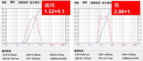 2、折射率發(fā)生改變:現(xiàn)代激光粒度儀一般采用Mie散射理論,選擇正確的折射率直接決定了測試結(jié)果的準(zhǔn)確性,正確的折射率可以通過系統(tǒng)或測量來得到。下圖是同一樣品不同折射率時的測試結(jié)果差異。