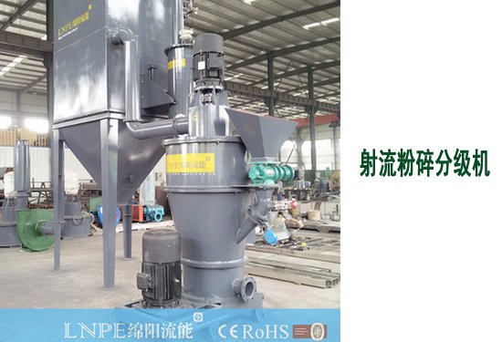 方案中的射流粉碎機是我公司針對有特點粒度段要求,成品率要求高,過粉碎少而開發的一種新型粉碎設備;其粉碎原理為原料加入磨機后先進行分選將原料中合格顆粒先分選出去,粗顆粒再進入射流磨進行粉碎,每個顆粒只碰撞一次,碰撞后馬上被抽走進行分選,合格顆粒即被分選出來,粗顆粒再進入射流磨粉碎,如此循環;物料在粉碎腔內停留的時間極短,不會造成合格顆粒的二次粉碎,從而有效的確保了其成品率。(生產5-45um的石墨時,其成品率可達到90%以上)