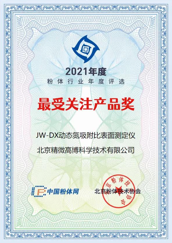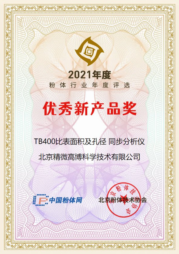 在剛剛結束的2021年度粉體行業“優秀新產品”評選活動中, 精微高博在眾多廠商的激烈競爭中脫穎而出,TB400系列比表面積及孔徑同步分析儀榮獲2021年度粉體行業“優秀新產品獎” ,JW-DX動態氮吸附法比表面積儀榮獲2021年度粉體行業“最受關注產品獎” 。
