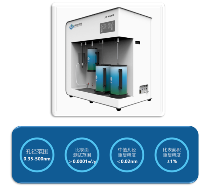 實驗中用到的比表面積測試儀為JW-BK200C比表面及孔徑分析儀,JW-BK200C比表面及孔徑測試儀配置1torr/0.1torr高精度小量程傳感器,及10-8Pa渦輪分子泵,適合分子篩、催化劑、活性炭等多微孔樣品的超微孔分析。