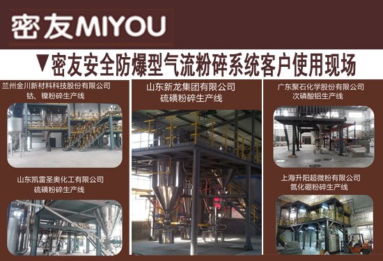 密友安全防爆型氣流粉碎系統已在山東新龍集團有限公司、蘭州金川新材料科技股份有限公司、山東凱雷圣奧化工有限公司、廣東聚石化學股份有限公司、上海升陽超微粉有限公司等企業使用,運行安全良好。