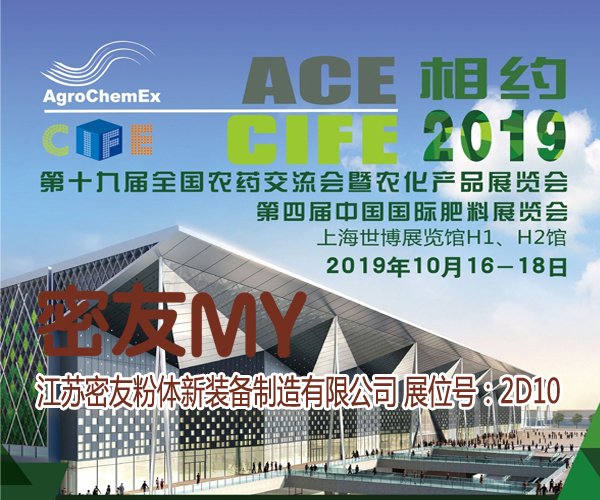 農化行業年度盛會--“第十九屆全國農藥交流會暨農化產品展覽會、第四屆中國國際新型肥料展覽會”將于10月16-18日在上海世博館舉辦。江蘇密友粉體新裝備制造有限公司與您共同探討農藥農化行業智能化設備。