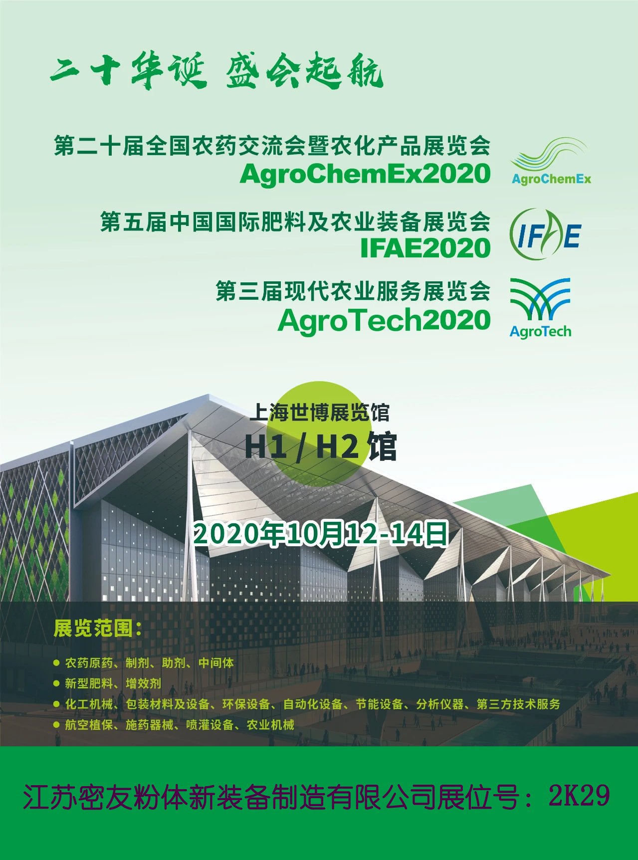 全球農(nóng)化行業(yè)年度盛會(huì),“第二十屆全國農(nóng)藥交流會(huì)暨農(nóng)化產(chǎn)品展覽會(huì)、第五屆中國國際肥料及農(nóng)業(yè)裝備展覽會(huì)、現(xiàn)代農(nóng)業(yè)服務(wù)展覽會(huì)”將于10月12-14日在上海世博館隆重舉辦。江蘇密友粉體新裝備制造有限公司與600多家農(nóng)化行業(yè)企業(yè)一道齊聚上海,共襄盛會(huì)。