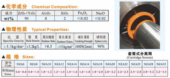 耐諾釔穩(wěn)定氧化鋯珠(NanorZr-95)采用氧化釔作穩(wěn)定劑,微珠采用獨創(chuàng)的滴定滾動成型、中溫?zé)憾ㄏ嗟墓に囍瞥伞P螤钣星蛐巍A柱形兩種。微晶顆粒的直徑小于0.4μm使介質(zhì)具有優(yōu)異的耐磨性,小粒徑珠子匹配棒銷式高能量密度砂磨機,而大粒徑球特別適合立式攪拌磨、臥式滾動球磨機、振動磨等設(shè)備對各種拒絕污染的漿料和粉料的濕法、干法的超細(xì)分散及研磨。