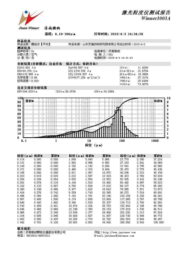 靈康藥業集團股份有限公司是一家集醫藥研發、生產、銷售為一體的創新型集團企業。經過十年的創業和發展,成為中國醫藥行業中具備雄厚實力的高科技、高成長的集團型企業。公司主導產品“注射用丙氨酰谷氨酰胺”榮獲科技部“國家重點新產品”,“注射用果糖”、“注射用氨曲南”榮獲科技部"國家火炬計劃項目"證書。公司研發的多個醫藥產品獲得“科學技術進步獎”。集團研發機構下設合成藥物研究中心、制劑研究中心、天然藥物研究中心、分析測試中心等研究室。靈康藥業集團股份有限公司醫藥產品研發與生產的需求,與濟南微納顆粒儀器股份有限公司合作,使用微納產品進行粒度檢測。通過對產品的測試分析,為品質檢驗及優化提供技術依據。以下為酮洛芬測試報告: