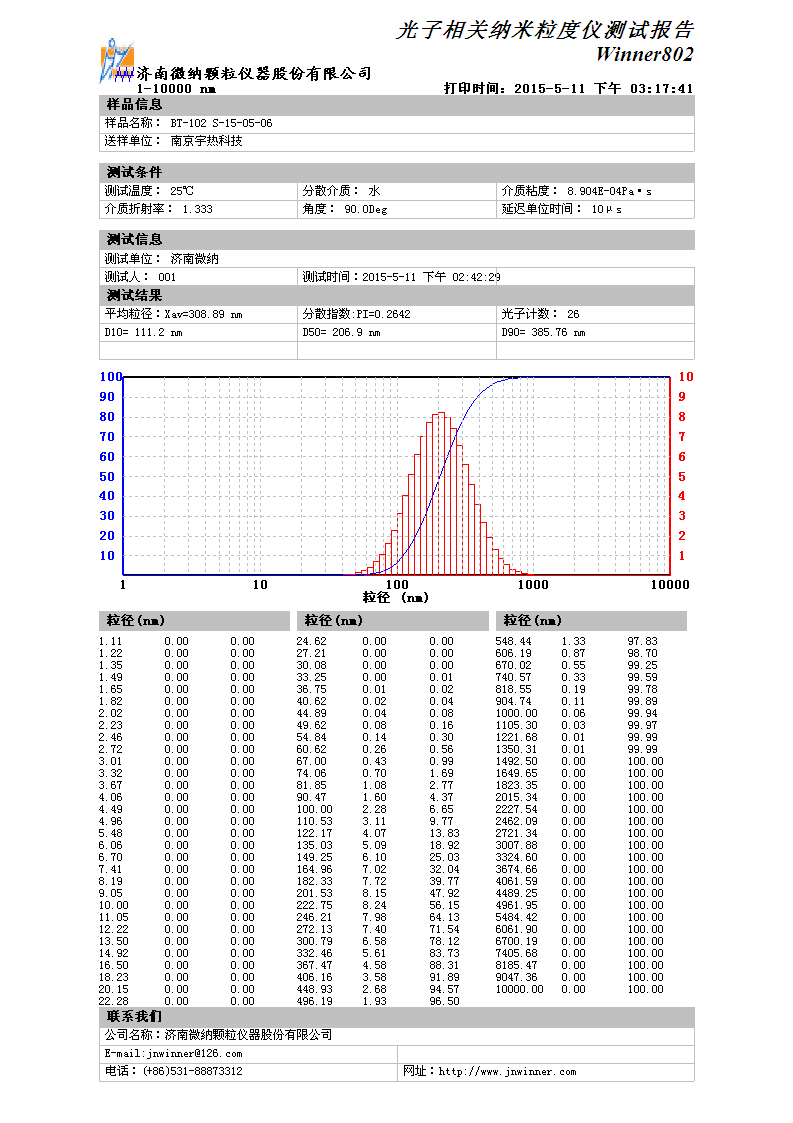 本次測試采用的是Winner802納米粒度儀,測試范圍1-10000nm。測試樣品鈦酸鋇粒度較小,約為幾百納米。.樣品顆粒細,比表面積大,顆粒間及易發生團聚,測試之前必要將鈦酸鋇充分分散。先取少量樣品放入燒杯,加3-5滴50%的六偏磷酸鈉溶液,將樣品充分浸濕后,加20ml水,分別超聲2、5、10分鐘,再移取5mL樣品到樣品池中進行測試。3.超聲5分鐘與超聲10分鐘結果變化不大,通過比較加3-5滴六偏磷酸鈉超聲5分鐘測試數據穩定可靠。測試濃度不要太高,一般光子數在20-30較好。測試數據穩定,重復性誤差、標準偏差都較小。測試結果如下: