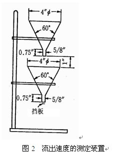 流出速度(flow velocity)是將物料加入于漏斗中測定全部物料流出所需的時間來描述,測定裝置如圖2所示。如果粉體的流動性很差而不能流出時加入100μm的玻璃球助流,測定自由流動所需玻璃球的量(w%),以表示流動性。加入量越多流動性越差。