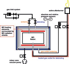 HTK系列加熱元件與保溫材料為相同的金屬材料制成,保溫材料由鎢或鉬制成的輻射屏蔽構成(根據所選擇的爐型)。HTK W的最高溫度為2200°C,HTK MO為1600°C。在排膠過程中產生的廢氣通過可加熱的廢氣管道排出,并在尾氣燃燒火炬中催化燃燒。 CARBOLITE GERO(卡博萊特?蓋羅)通過切換進氣方式實現對于環境要求較高的材料無污染燒結,如下圖所示。