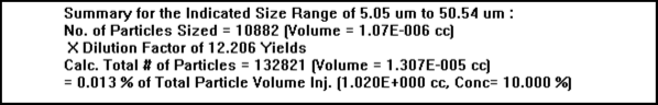 答:PFAT5——美國(guó)藥典對(duì)乳劑大顆粒尾部(Large- Diameter Tail)分布規(guī)定,指待測(cè)樣品的粒徑值(X)在5 μm<X<50 μm的體積占所測(cè)樣品油相體積的百分比,其數(shù)值小于0.05%屬于合格。 AccuSizer 780系列產(chǎn)品的操作軟件中有Volume Fraction calculation計(jì)算模塊,此模塊符合方法II的規(guī)范。。