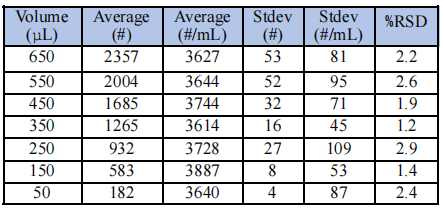 為了驗證儀器,下表是以15um的USP Particle CoumntRS標準粒子(顆粒濃度:3118-4218 #/mL),搭配微量進樣系統(tǒng),進樣量從650mL到50mL,分別測三次算出其平均顆粒濃度,并計算相對標準偏差RSD值。從結(jié)果可知,儀器最小進樣量可達50L,RSD仍保持在2%左右。