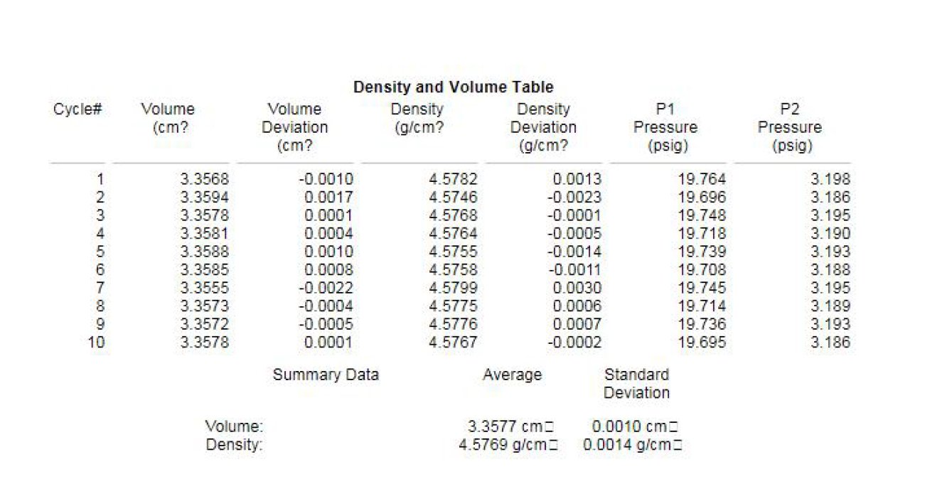 從上面的表格中可以看出,材料的真實體積都在3.35cm3 范圍內,僅在小數點后第三位出現浮動,計算得出的密度約為 4.57 g/cm3,同樣僅在小數點后第三位出現浮動。這個變化可以說非常小了。