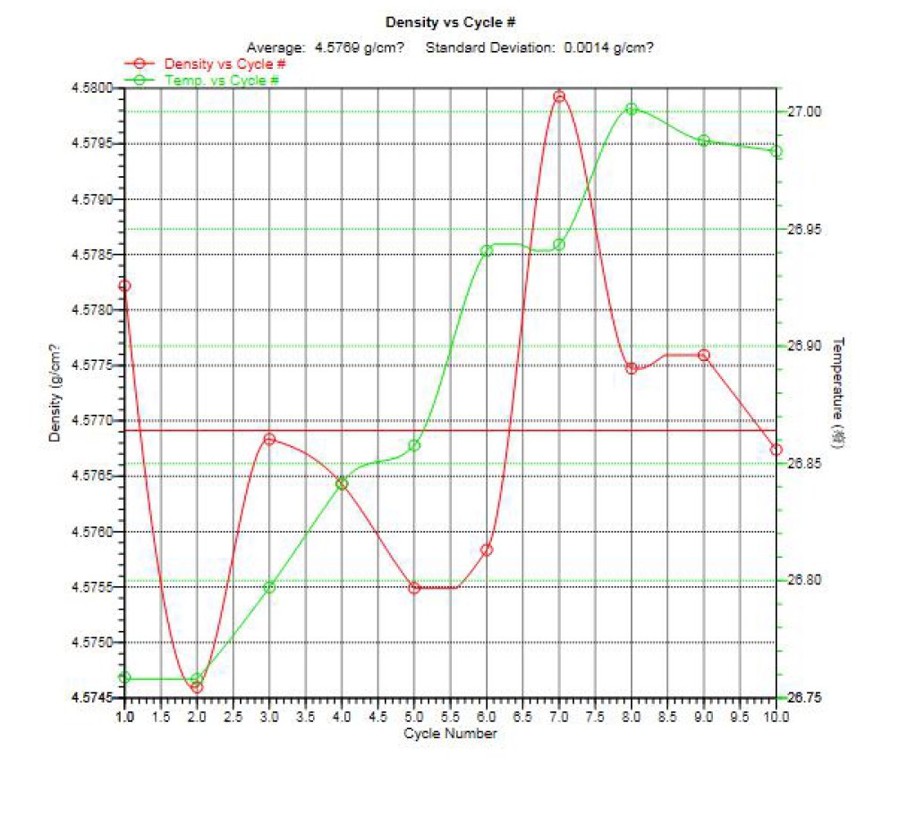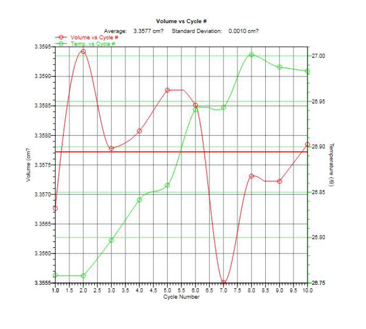 接下來我們以體積對循環次數做圖,并以平均體積做標準線,可以得到下圖所示的結果。圖中紅色的圓點是十次的體積測試值,中間紅色的水平線為體積平均值。通過這個圖不難看出,十次測試的體積結果是圍繞著體積平均值波動,非常穩定,并未出現持續走低等異?,F象。該圖中的綠色曲線是儀器內部的溫度變化曲線。從圖中可以看出,整個測試過程中,儀器內部溫度僅由26.76℃增加到26.98℃,過程中所到達的最高溫度是27℃。整個測試過程中,最大溫度浮動不超過 0.3℃。并且在溫度浮動到27℃時,儀器自動散熱,將溫度穩定下來。
